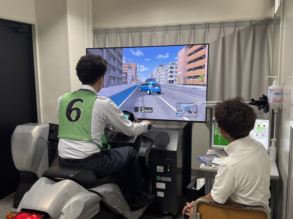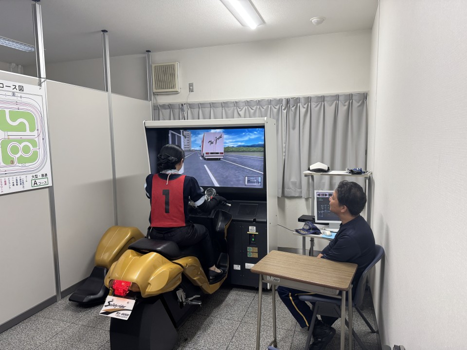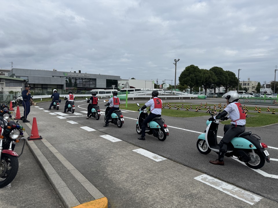 渉外業務でバイクを使用されている営業職員の方を対象に交通ルールの再確認とブレーキやタイヤなどの点検方法、二輪専用コースを使って安全走行の基本を学んでいただきました。また、二輪シミュレータを使った危険予測体験も実施しました。今後も自己防衛運転を心掛けていただくと共に、自身が加害者にならないための安全運転を意識していただければ幸いです。