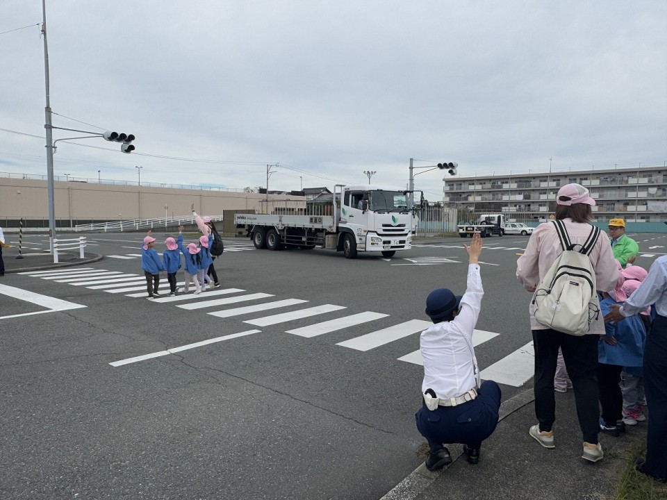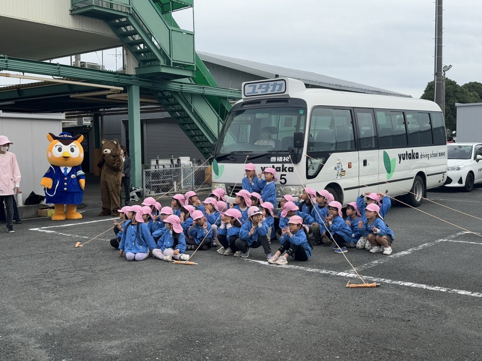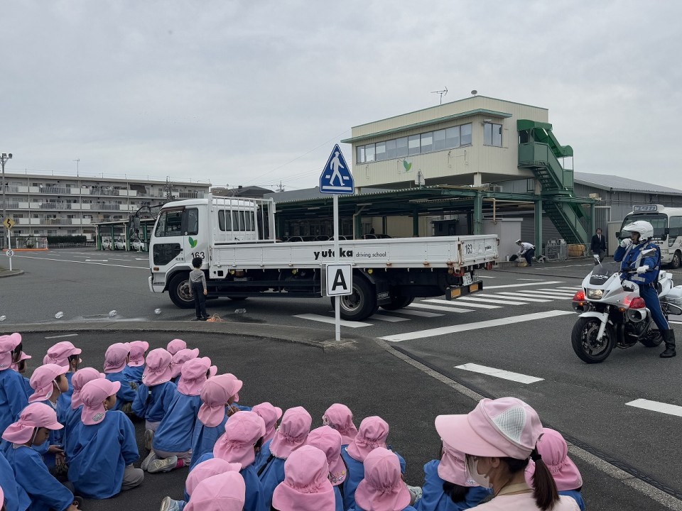 磯辺保育園の年長組37名を対象に豊橋警察署交通課、豊橋市役所安全生活課の皆様にご協力いただき、交通ルールや道路での危険をわかりやすく説明していただきました。コース内では園児が横断歩道の正しいわたり方を体験し、トラックを使用して死角や内輪差の危険性を見学していただきました。